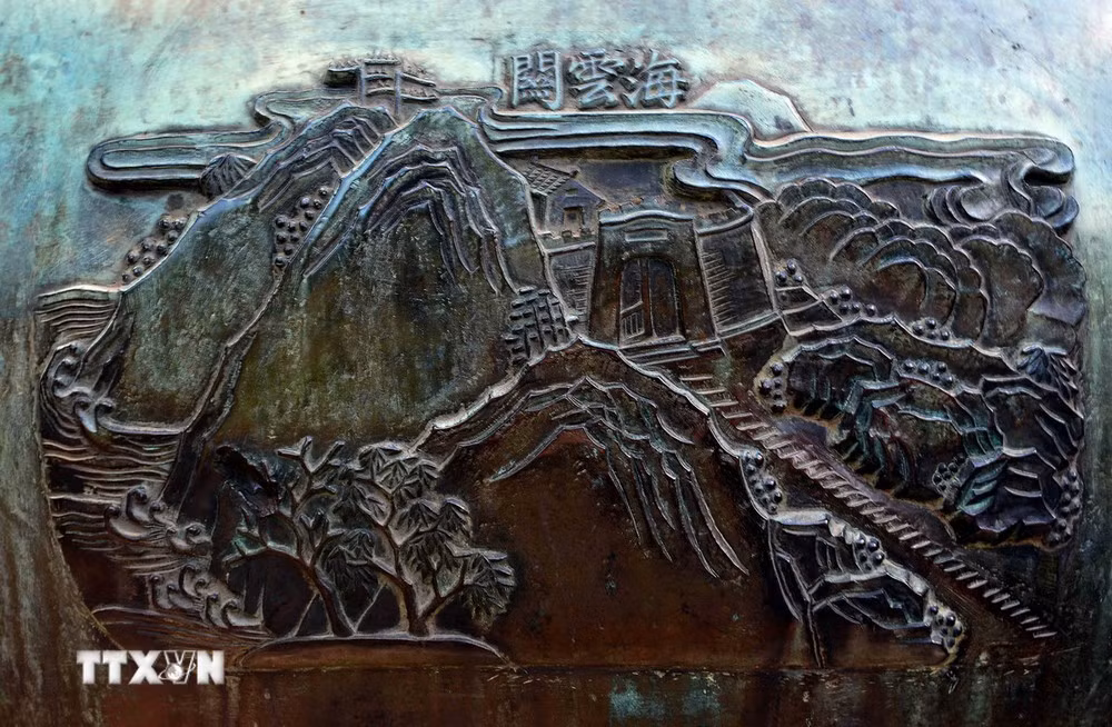 Họa tiết Hải Vân quan được chạm khắc trên cửu đỉnh.