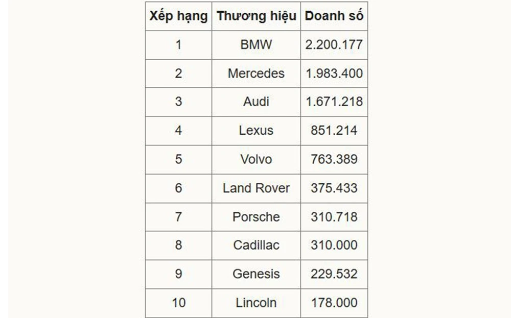 Dưới đây là top 10 thương hiệu xe sang bán chạy trên thế giới 2024, theo số liệu các hãng công bố: