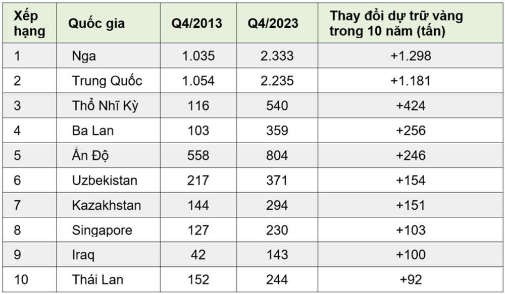 Nga dẫn đầu danh sách khi mua vào tổng cộng 1.298 tấn vàng trong 10 năm qua, tương đương 125% lượng vàng dự trữ vào cuối năm 2013. Tính tới cuối năm 2023, ngân hàng trung ương Nga nắm giữ 2.333 tấn vàng.