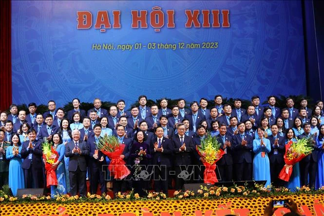 Thường trực Ban Bí thư Trương Thị Mai, Chủ tịch Ủy ban Trung ương MTTQ Việt Nam Đỗ Văn Chiến và Phó Thủ tướng Trần Hồng Hà chúc mừng Ban Chấp hành Tổng Liên đoàn Lao động Việt Nam khoá XIII. Ảnh: TTXVN