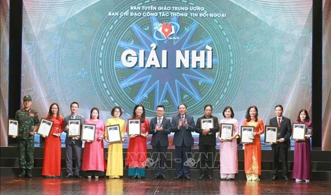 Đồng chí Lê Quốc Minh, Ủy viên Trung ương Đảng, Tổng Biên tập Báo Nhân Dân, Phó Trưởng Ban Tuyên giáo Trung ương, Chủ tịch Hội Nhà báo Việt Nam và đồng chí Nguyễn Văn Hùng, Ủy viên Trung ương Đảng, Bộ trưởng Văn hóa, Thể thao và Du lịch trao giải Nhì cho các tác giả, nhóm tác giả đoạt giải.
