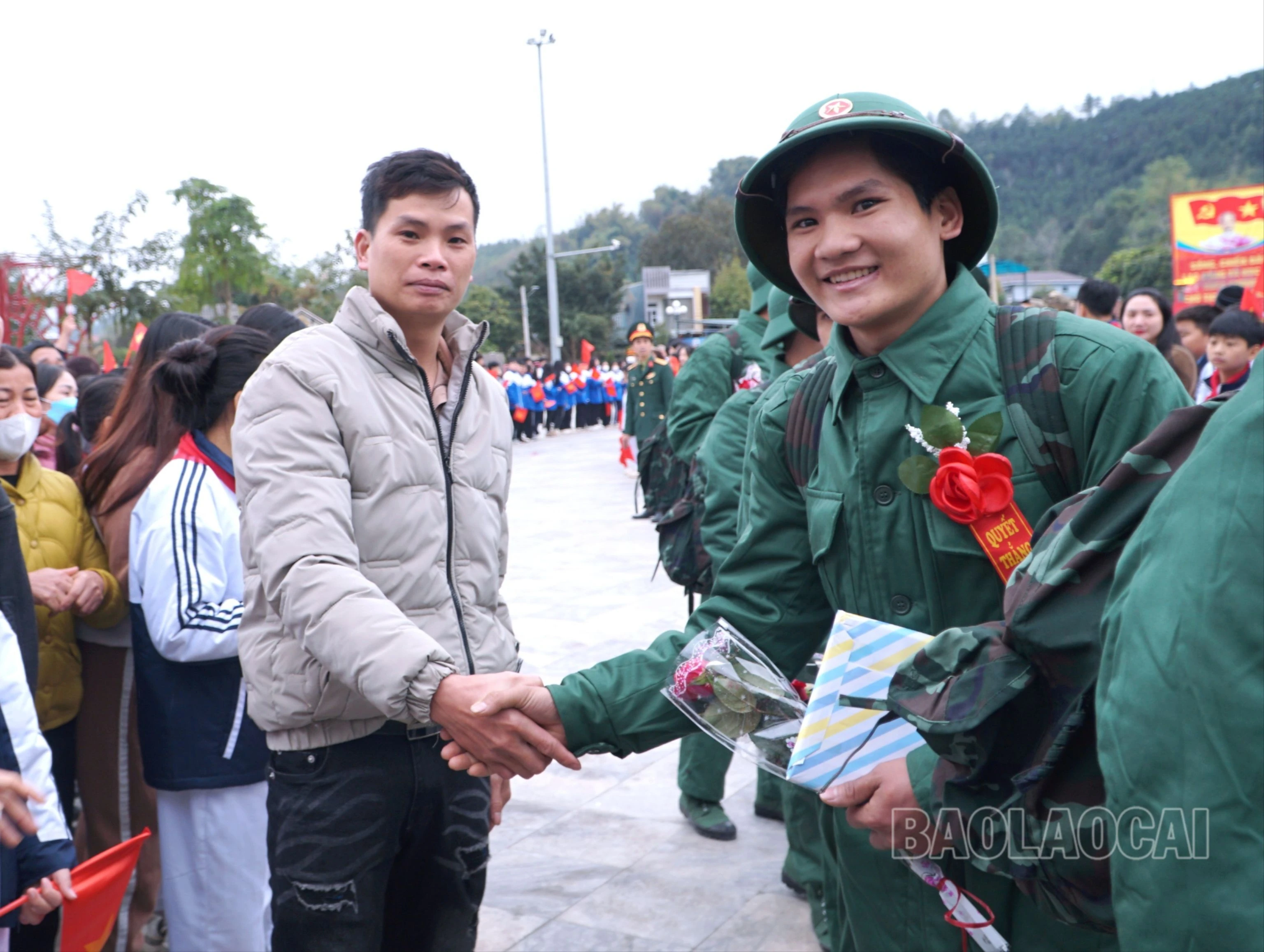 Sau nghi lễ thắp lửa truyền thống, ký kết giao, nhận quân, thành viên Hội đồng nghĩa vụ quân sự tỉnh và lãnh đạo huyện Bảo Thắng đã tặng hoa chúc mừng, động viên tân binh lên đường nhập ngũ, quyết tâm hoàn thành nhiệm vụ được giao.