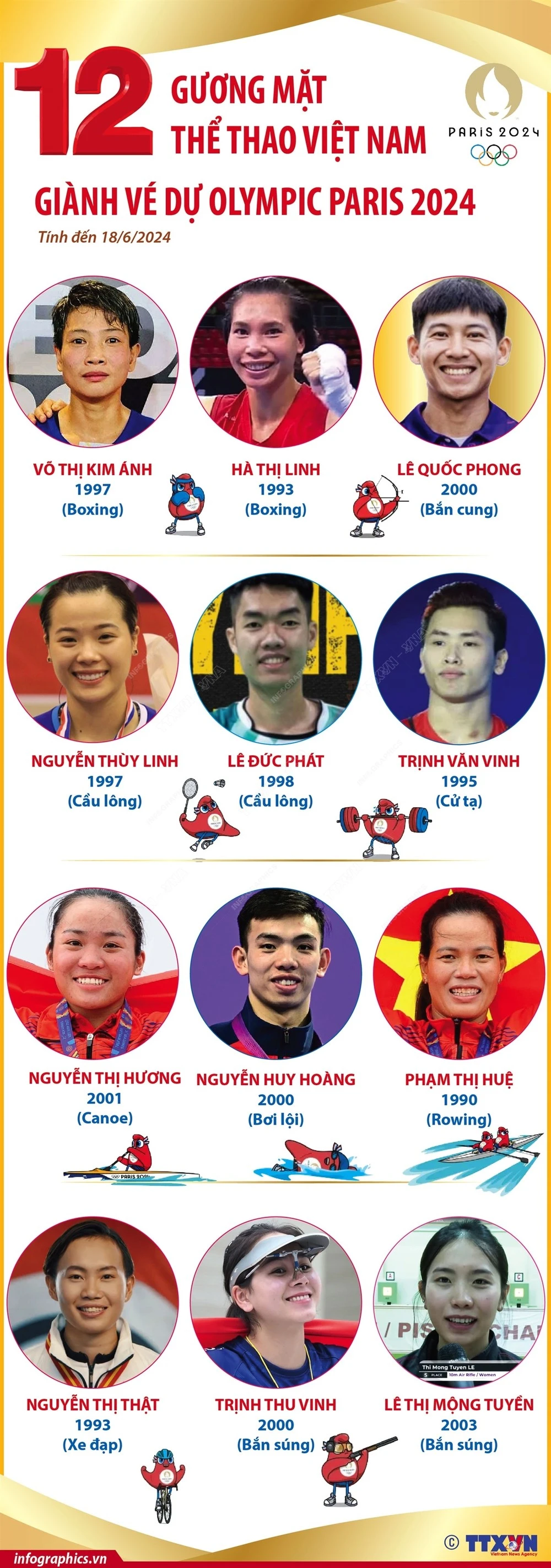 Theo Cục Thể dục Thể thao, tính đến ngày 18/6/2024, Thể thao Việt Nam có 12 vận động viên được chính thức tham dự Olympic Paris 2024.