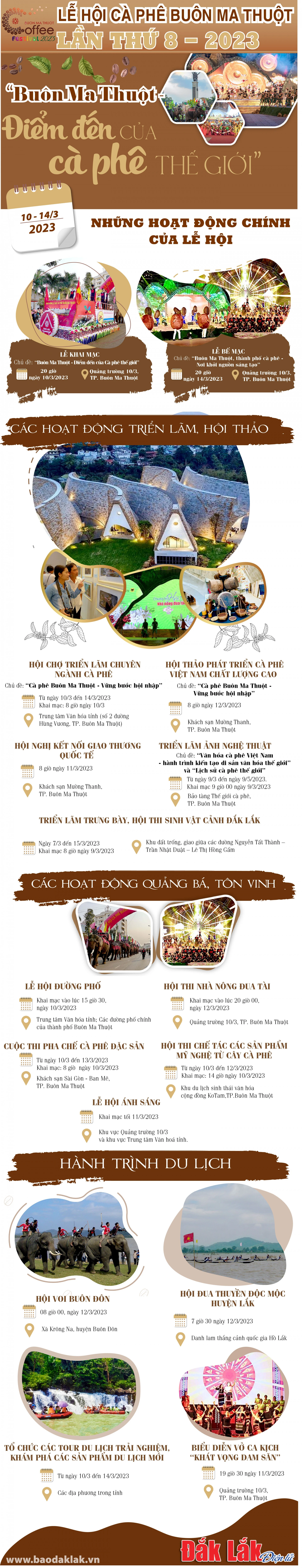 Với chủ đề "Buôn Ma Thuột - Điểm đến của cà phê thế giới", Lễ hội Cà phê Buôn Ma Thuột lần thứ 8 năm 2023 sẽ được tổ chức quy mô lớn, với 18 hoạt động chính; hình thức thể hiện theo xu hướng hội nhập quốc tế, phong cách hiện đại làm nổi bật chủ đề chính.