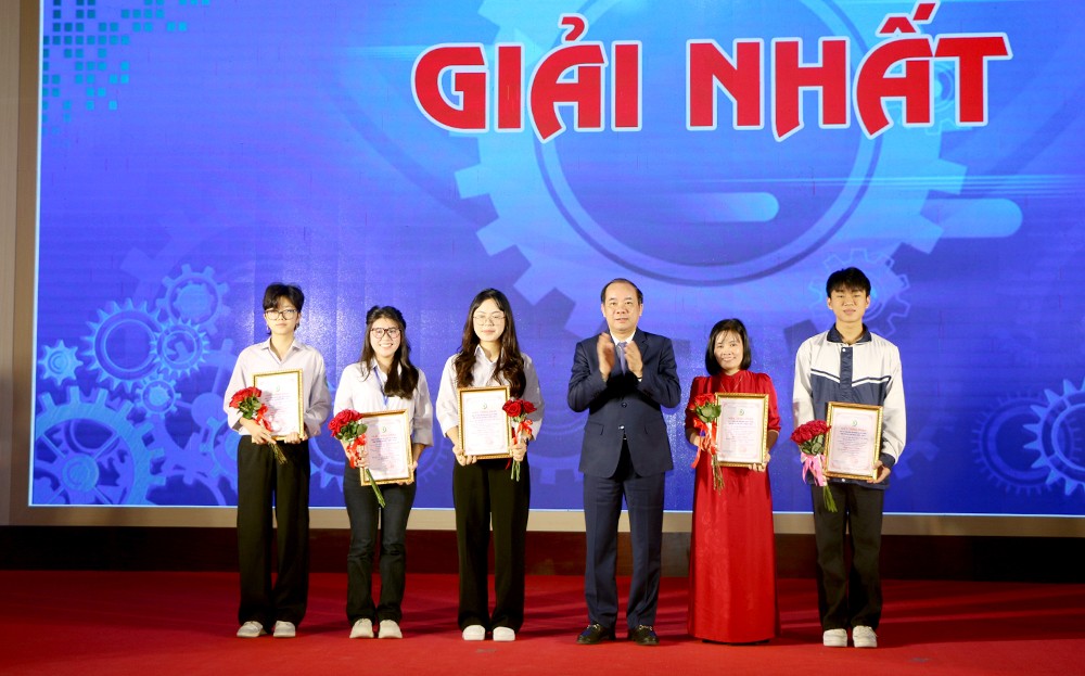 Đồng chí Tạ Văn Long - Phó Bí thư Thường trực Tỉnh ủy, Chủ tich HĐND tỉnh, Bí thư Đảng đoàn, Chủ tịch Liên hiệp Hội Khoa học và Kỹ thuật tỉnh trao giải Nhất cho các tác giả, nhóm tác giả xuất sắc của Hội thi.