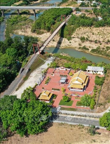 Cầu treo Bến Tắt bắc qua thượng nguồn sông Bến Hải, bên phải là Đền thờ vọng liệt sỹ Bến Tắt - Trường Sơn.