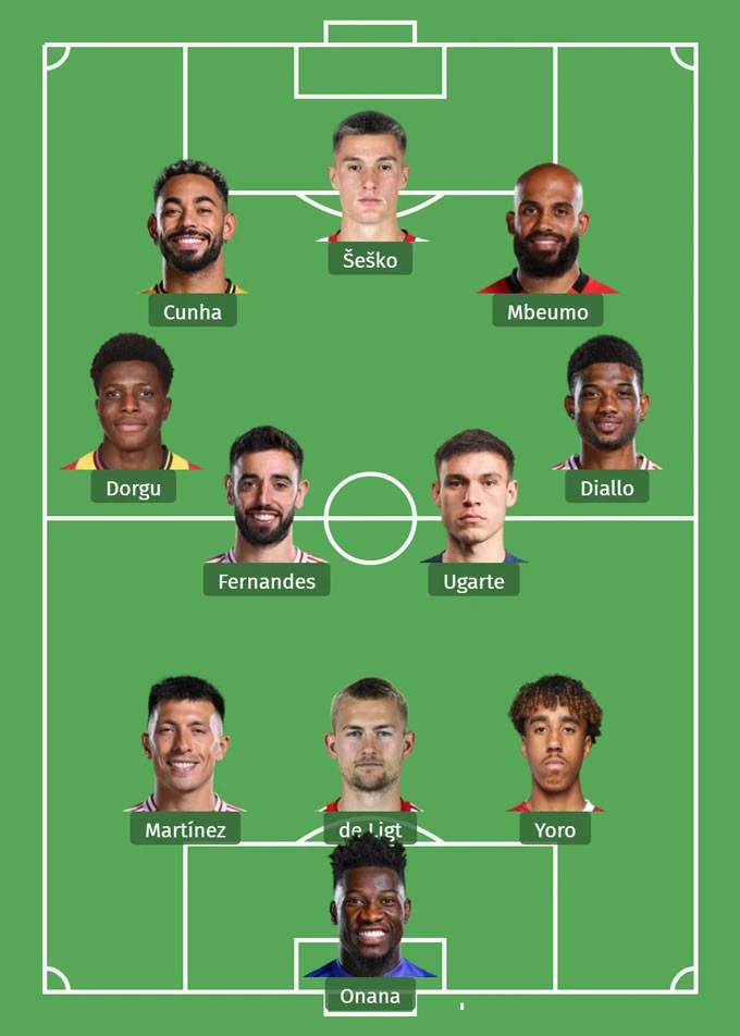 MU được cho là đã đưa ra đề nghị trị giá 74 triệu bảng cho tiền đạo Benjamin Sesko của RB Leipzig, nhằm "hớt tay trên" Newcastle. Nếu thành công, Quỷ đỏ sẽ có cho mình đội hình đủ mạnh để chinh chiến trên các đấu trường mùa tới. Theo đó, bắt chính trong khung gỗ vẫn là Onana. Hàng thủ 3 người gồm Leny Yoro, Matthijs De Ligt và Lisandro Martinez. Amad Diallo và Patrick Dorgu sẽ án ngữ 2 cánh còn Bruno Fernandes và Ugate đá cặp tiền vệ trung tâm. Bộ ba tân binh Cunha, Mbeumo và Sesko sát cánh trên hàng công.
