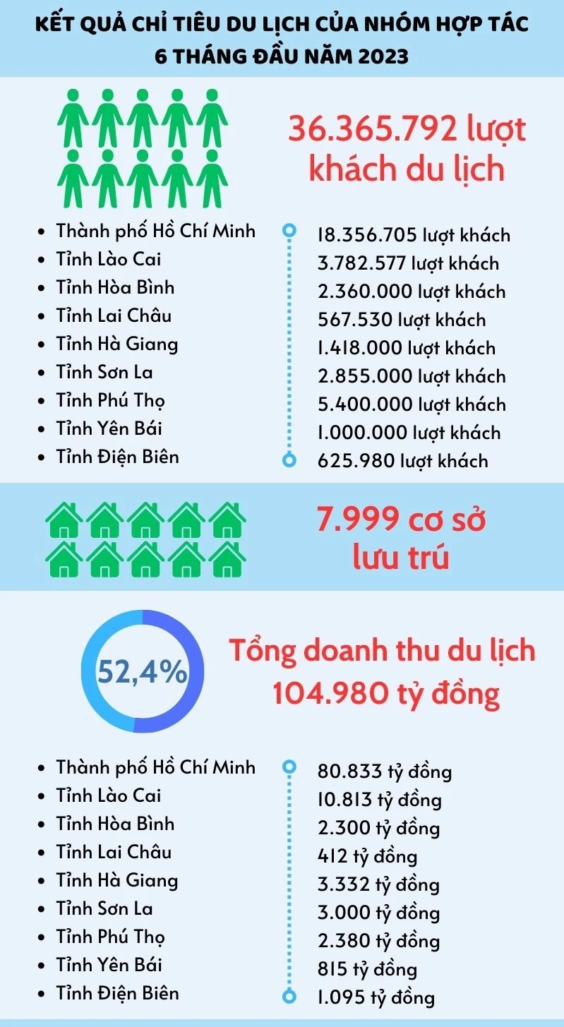 6 tháng đầu năm 2023, các tỉnh, thành phố trong Nhóm hợp tác thường xuyên phối hợp trao đổi, cung cấp thông tin, chia sẻ kinh nghiệm, hỗ trợ nhau trong công tác quảng bá, xúc tiến, kêu gọi thu hút đầu tư các tập đoàn, dự án du lịch lớn tại địa phương; tình hình phát triển du lịch địa phương thông qua việc ban hành các Đề án, Nghị quyết, Quy hoạch, Kế hoạch trung và dài hạn; tăng trưởng thị trường khách du lịch; các vấn đề tiêu cực, hành vi vi phạm trong hoạt động du lịch; thiết lập hệ thống công nghệ thông tin phục vụ hoạt động xúc tiến du lịch chung giữa 8 tỉnh Tây Bắc mở rộng và thành phố Hồ Chí Minh.