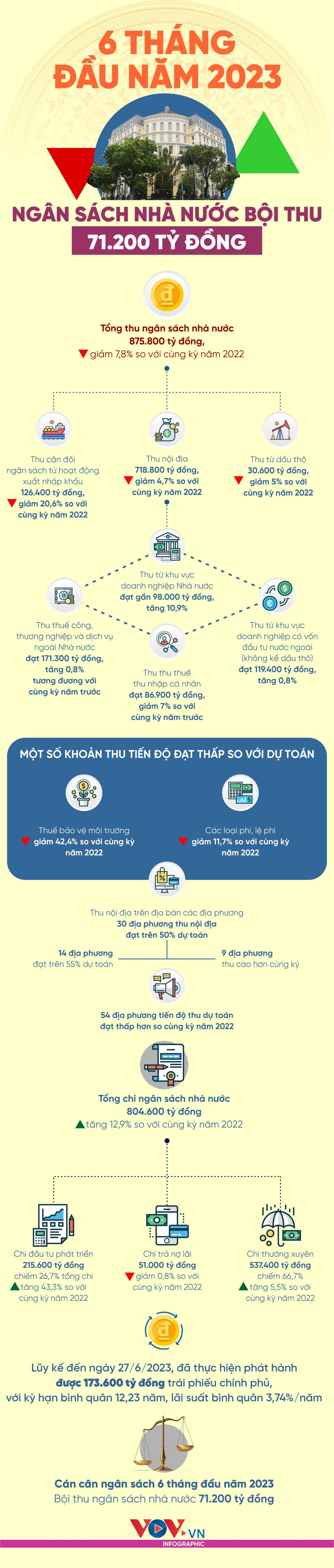 6 tháng đầu năm, tổng thu ngân sách nhà nước (NSNN) ước tính 875.800 tỷ đồng, tổng chi NSNN ước tính 804.600 tỷ đồng; dự toán mức bội thu NSNN 71.200 tỷ đồng.
