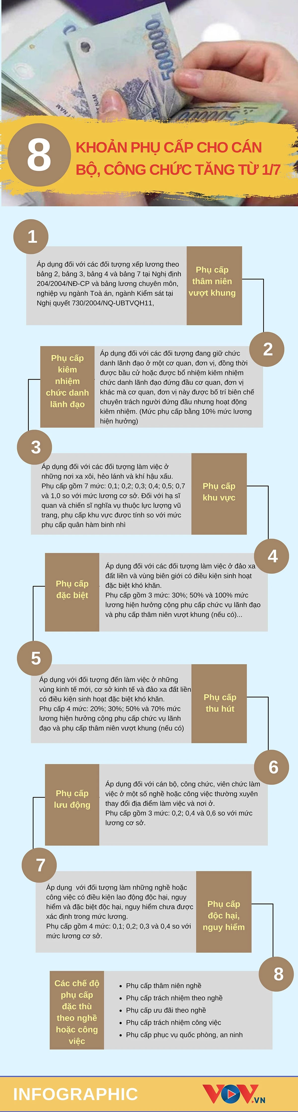 Từ 1/7 tiền lương cơ sở tăng từ 1.490.000 đồng/tháng lên 1.800.000 đồng/tháng. Theo đó, các khoản phụ cấp tính theo lương cơ sở cũng đồng loạt tăng thêm 20,8%...
