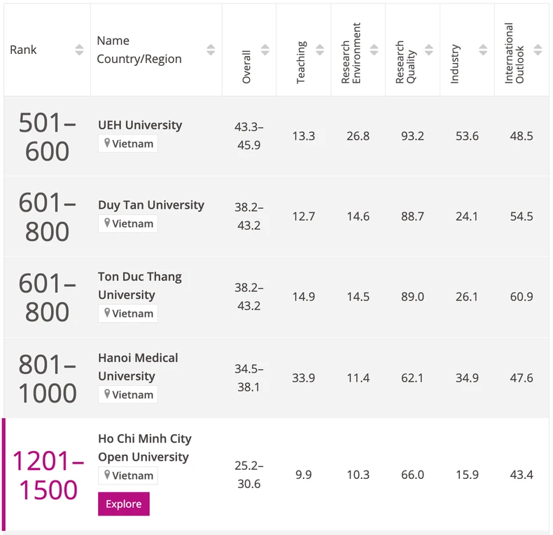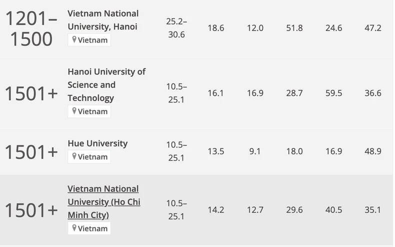 Năm trước, trong danh sách xếp hạng THE WUR 2024, Việt Nam góp mặt 6 cơ sở giáo dục đại học.