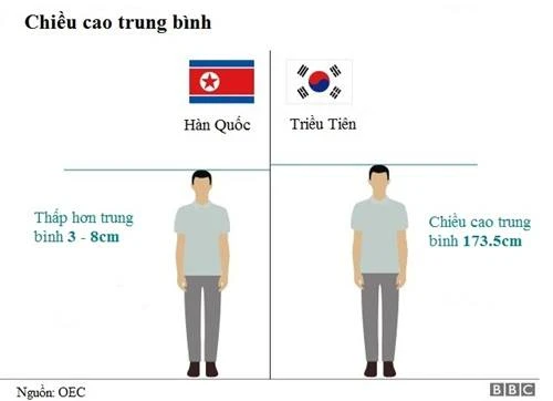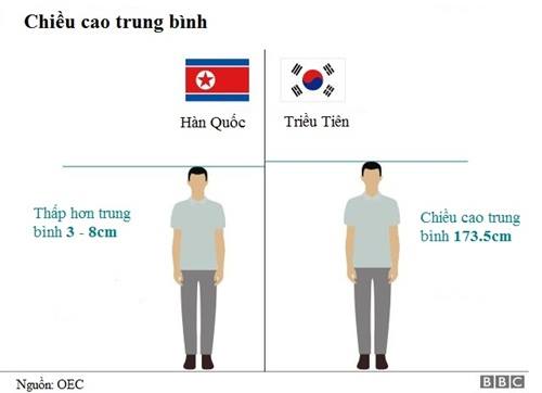 Một số nghiên cứu cho rằng người Triều Tiên có chiều cao trung bình thấp hơn người Hàn Quốc. Giáo sư Daniel Schwekendiek thuộc Đại học Sungkyunkwan ở Seoul đã nghiên cứu chiều cao của những người tị nạn Triều Tiên khi họ vượt biên vào Hàn Quốc và nhận thấy chiều cao trung bình của họ thấp hơn trung bình từ 3 - 8cm.