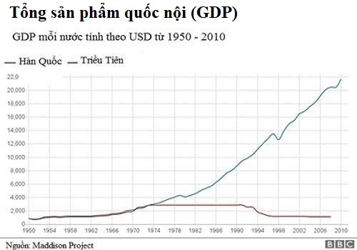 Cho đến năm 1973, mức độ phát triển kinh tế của Triều Tiên và Hàn Quốc vẫn tương đương nhau. Từ sau đó, Hàn Quốc phát triển tăng vọt, trở thành một trong những nhà sản xuất công nghiệp hàng đầu thế giới với các tập đoàn gia đình lớn như Samsung, Hyundai. Trong khi đó, Triều Tiên phát triển trì trệ trong những năm 1980.