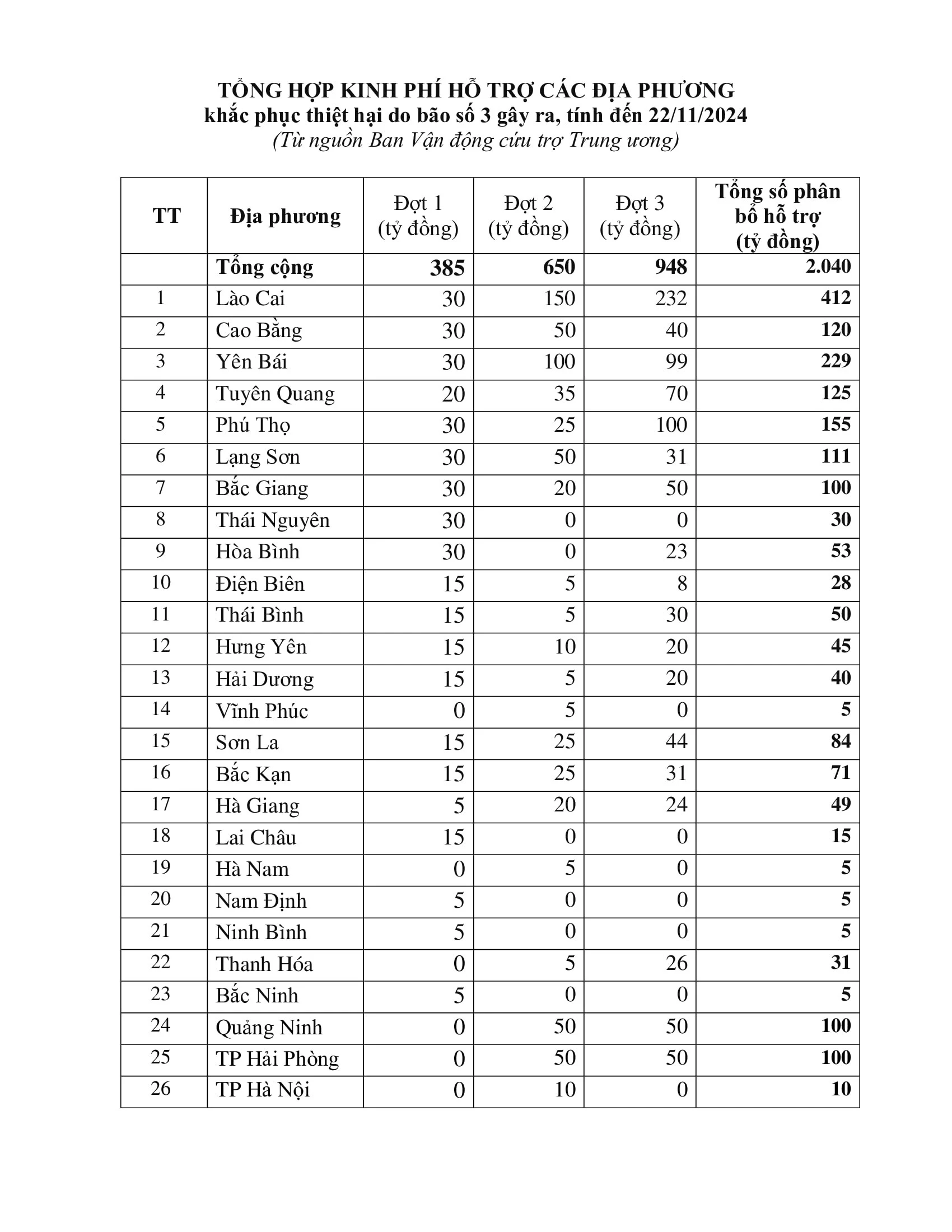 Từ số tiền tiếp nhận được, đến hết ngày 21/11/2024, Ban Vận động Cứu trợ Trung ương đã phân bổ tổng số tiền là 2.040,050 tỷ đồng (Hai nghìn không trăm bốn mươi tỷ, không trăm năm mươi triệu đồng). Số tiền tiếp nhận được phân bổ thành 3 đợt. Trong đó: Đợt 1 phân bổ số tiền 385 tỷ đồng; Đợt 2 phân bổ số tiền 650 tỷ đồng; Đợt 3 phân bổ số tiền 948 tỷ đồng và số kinh phí chuyển trực tiếp theo địa chỉ là 57,050 tỷ đồng.