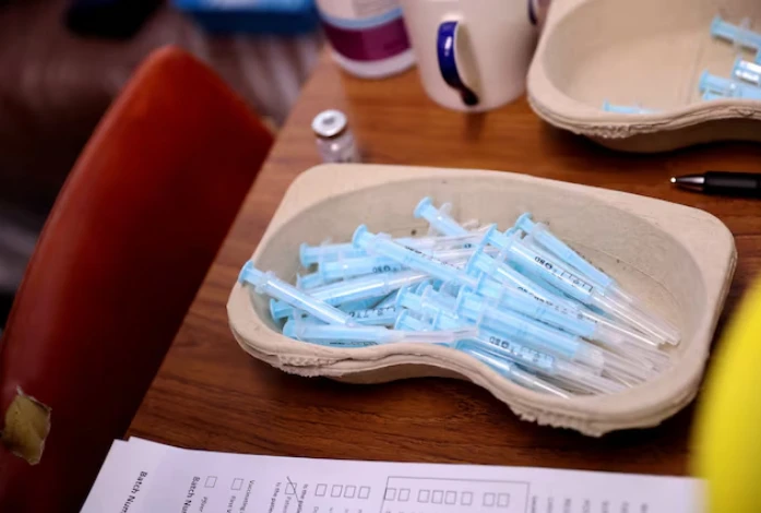 Các ống tiêm chứa các liều vaccine tăng cường COVID-19 được nhìn thấy trong bối cảnh đại dịch bệnh do virus corona gây ra, tại Trung tâm Cộng đồng Smallthorne ở Stoke-on-Trent, Anh, ngày 15/12/2021.