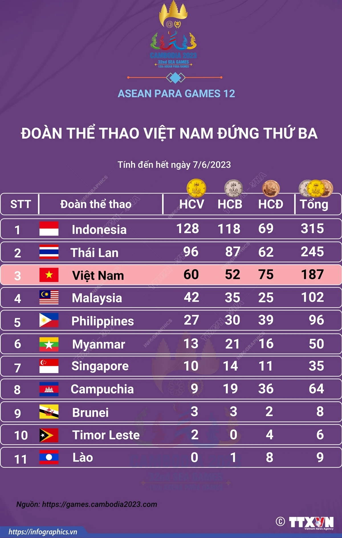 Kết thúc ngày thi đấu thứ 4 tại ASEAN Para Games 12, đoàn thể thao Việt Nam giành được 60 huy chương Vàng, 52 huy chương Bạc và 75 huy chương Đồng, tiếp tục giữ vị trí thứ 3 trên bảng tổng sắp huy chương, sau đoàn thể thao Indonesia (thứ nhất) và Thái Lan (thứ 2).