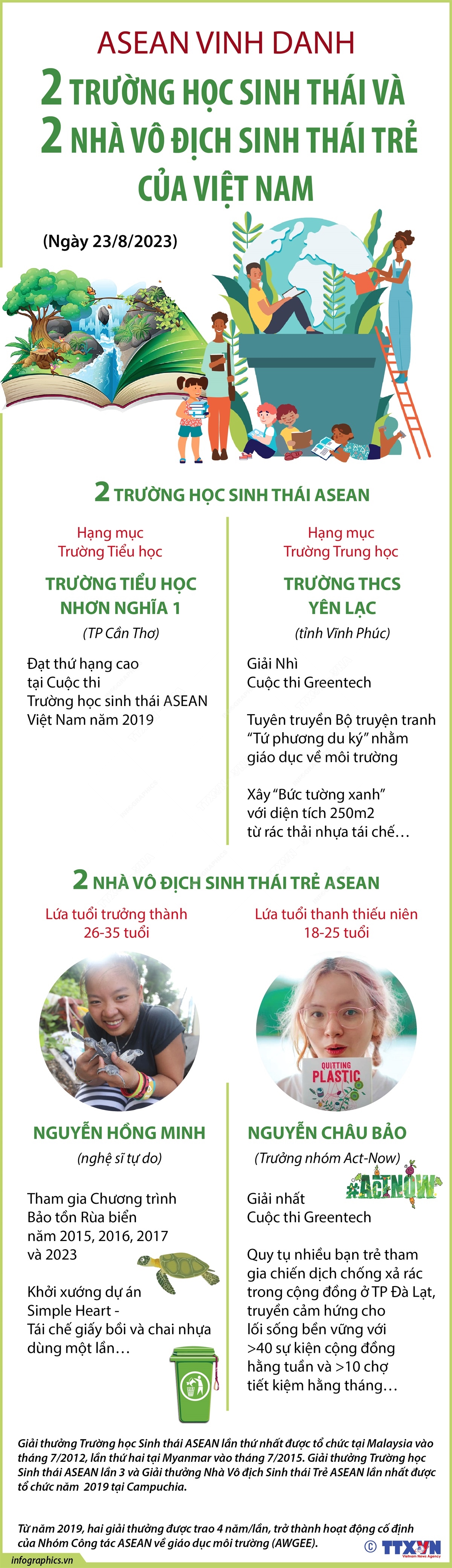 Trong khuôn khổ Hội nghị Bộ trưởng Môi trường ASEAN lần thứ 17 tổ chức tại thủ đô Viêng Chăn, Lào, Việt Nam có thêm hai trường học sinh thái và hai nhà vô địch sinh thái trẻ ASEAN được vinh danh tại Lễ trao Giải thưởng Trường học Sinh thái ASEAN (ASEAN Eco-schools).