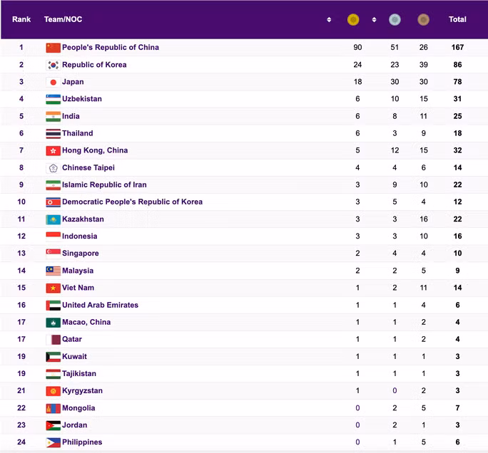 Với 1 HCV, 1 HCB và 2 HCĐ giành được trong ngày, đoàn TTVN từ vị trí thứ 22 đã vượt lên 7 bậc, xếp hạng 15 trên bảng tổng sắp huy chương tạm thời ASIAD 19 (1 HCV, 2 HCB, 11 HCĐ).