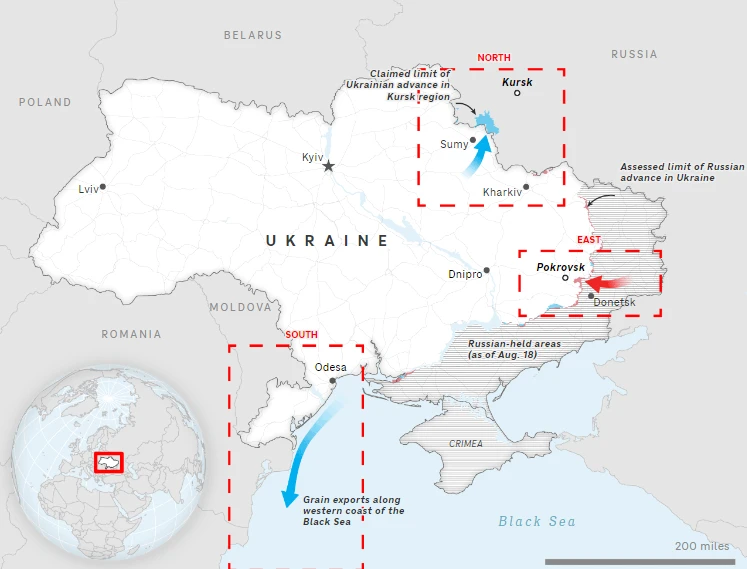 Mặt trận mới nhất nằm ngay bên kia biên giới phía bắc Ukraine, nơi quân đội Ukraine thực hiện cuộc xâm nhập bất ngờ vào lãnh thổ Nga hôm 6/8 và đang củng cố các vị trí của mình hai tuần sau bước đột phá đó.