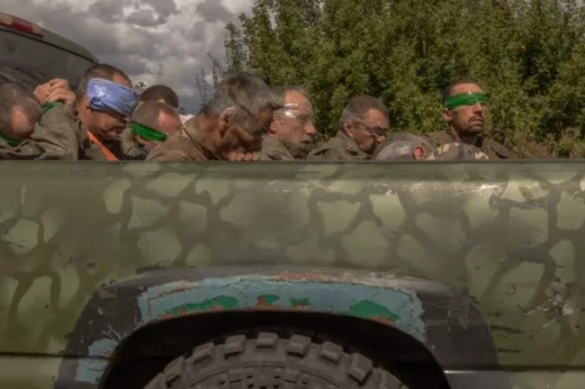 Một chiếc xe quân sự Ukraine chở đầy binh sĩ Nga bị bắt hướng về phía biên giới Ukraine với Nga. Ảnh: Kyiv Post