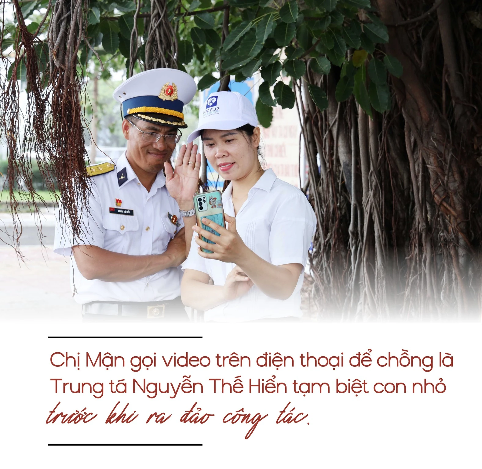 Chiều hôm đó trời lất phất mưa, từng tốp bộ đội ngồi dưới gốc cây, trên gờ tường hai bên lối đi chờ đến giờ xuất phát. Ngồi bên cạnh gốc đa có những chùm rễ dài thả đung đưa theo gió, chị Hoàng Thị Mận cùng chồng là Trung tá Nguyễn Thế Hiển ra đảo công tác lần này tranh thủ gọi điện về tạm biệt con nhỏ mới 18 tháng tuổi. Con còn nhỏ nên chị Mận phải gửi người thân trông giúp để ra cảng tiễn chồng.