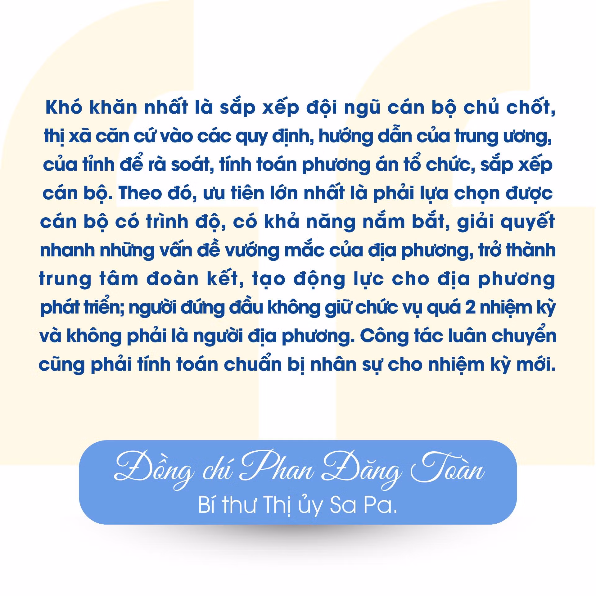 Đồng chí Phan Đăng Toàn, Bí thư Thị ủy Sa Pa cho biết quá trình giải quyết cán bộ dôi dư sau sáp nhập cũng là một đợt sàng lọc, lựa chọn cán bộ nhằm nâng cao năng lực lãnh đạo, kiện toàn tổ chức bộ máy cơ sở.