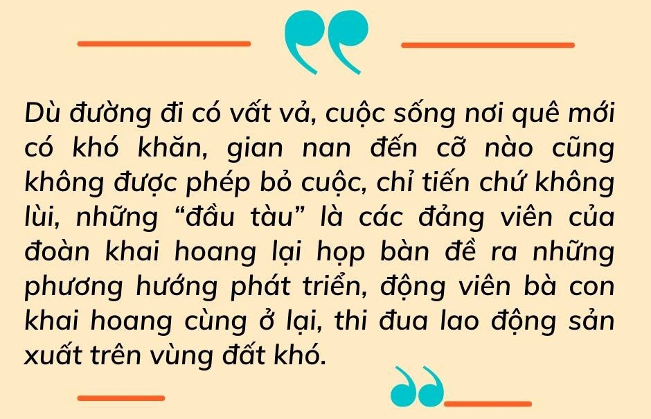Gian khó ngày đầu chất cao như núi, đói, rét, bệnh tật lại thêm nỗi nhớ nơi “chôn nhau, cắt rốn”, nên nhiều người có ý định bỏ cuộc trở về quê cũ. Tuy nhiên, khắc ghi lời dạy của Bác không được từ khổ, từ nan, học tinh thần phấn đấu suốt đời vì nước, vì dân của Bác, nhớ lời hứa với đồng chí, đồng đội lúc lên đường tại quê hương: “Dù đường đi có vất vả, cuộc sống nơi quê mới có khó khăn, gian nan đến cỡ nào cũng không được phép bỏ cuộc, chỉ tiến chứ không lùi”, những “đầu tàu” là các đảng viên của đoàn khai hoang lại họp bàn đề ra những phương hướng phát triển, động viên bà con khai hoang cùng ở lại, thi đua lao động sản xuất trên vùng đất khó.