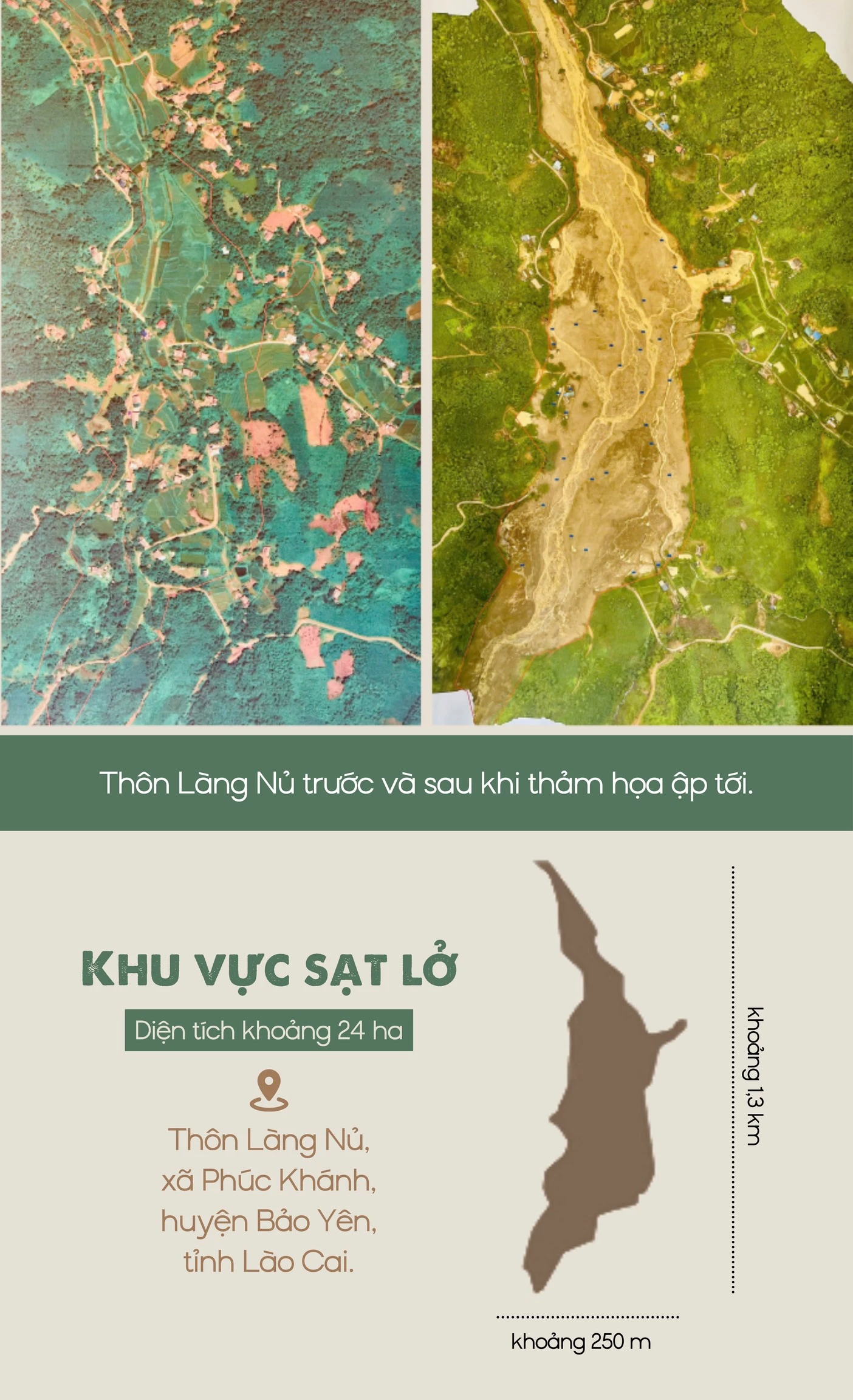 Ông Hoàng Văn Diệp, Trưởng thôn Làng Nủ cho hay: Thôn Nủ trước đây gồm hai thôn (thôn Nủ 1, thôn Nủ 2), năm 2022 sáp nhập lại thành một. Vùng bị sạt lở, vùi lấp là Nủ 2 với 37 hộ dân, số lượng 158 khẩu. Toàn thôn có 167 hộ, chủ yếu là dân tộc Tày. Con suối Nủ như một vạch kẻ giữa chia xóm Nủ 2 thành hai phần, hai bên là hai con đường chạy song song: đường nội bộ thôn Nủ 2 nằm giữa thung lũng, với bề mặt bằng phẳng hình thành nên cánh đồng màu mỡ. Làng Nủ là thôn cuối của xã Phúc Khánh, điểm cuối là núi Voi cũng là điểm tiếp giáp phân mốc của hai tỉnh Lào Cai và Yên Bái, bên này là huyện Bảo Yên, bên kia là huyện Lục Yên. Khi “quả bom nước”, do mưa lớn kéo dài tích tụ phía trên núi Voi vỡ tung thì hàng triệu mét khối nước kèm theo đất đá sập xuống vùi lấp, san phẳng cả thung lũng trù phú, bình yên bao đời nay. Sức tàn phá của lũ quét thật kinh hoàng, không thể ngờ chỉ sau một đêm cả Làng Nủ đã bị xóa sổ như chưa từng có người ở…