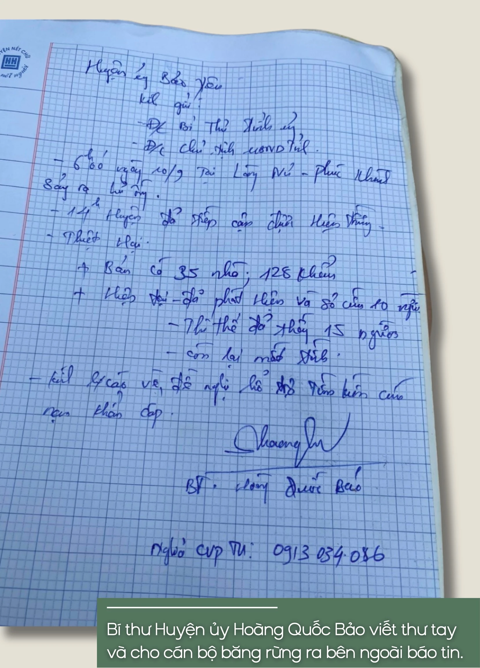 Giao thông bị chia cắt, khu vực này cũng hoàn toàn mất điện, mất liên lạc, khiến công tác chỉ huy, chi viện, thông tin ra bên ngoài gặp nhiều khó khăn. Để kết nối với bên ngoài và báo cáo nhanh về lãnh đạo tỉnh và thông báo cho các cơ quan của huyện chi viện, ứng cứu, anh Hoàng Quốc Bảo, Bí thư Huyện ủy phải viết thư tay để một cán bộ băng rừng truyền tin.