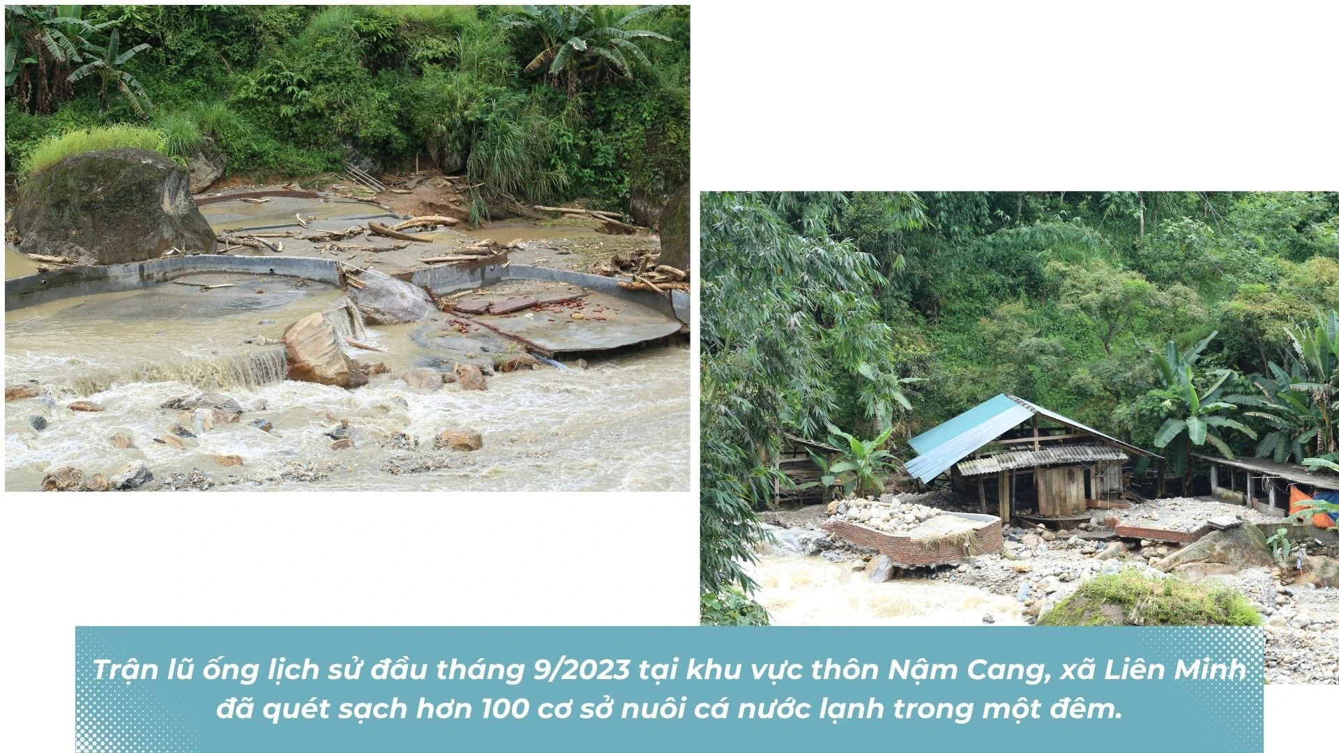 Hẳn nhiều người còn nhớ trận lũ ống lịch sử cùng xuất hiện trên 3 con suối Nậm Pá, Nậm Than, Nậm Cang xảy ra đầu tháng 9/2023 tại khu vực Nậm Cang, xã Liên Minh (thị xã Sa Pa) đã quét sạch hơn 100 cơ sở nuôi cá nước lạnh trong một đêm. Không chỉ toàn bộ ao nuôi bị vùi lấp, tài sản bị phá hủy, lũ ống còn cuốn trôi 7 người dân đang trông coi, chăm sóc những ao nuôi cá nước lạnh.