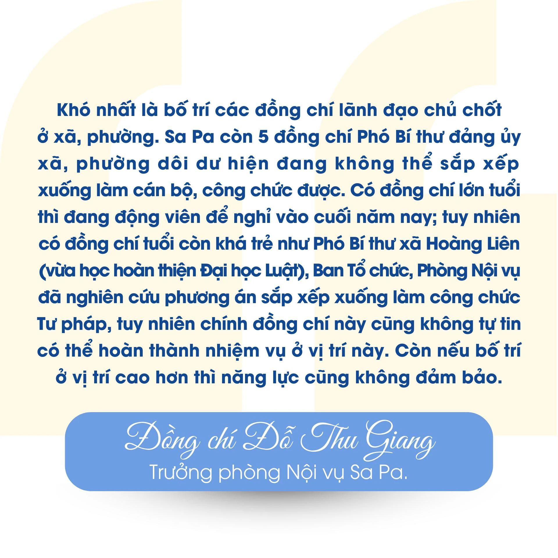 Tại thị xã Sa Pa, tính đến nay đã giải quyết chế độ chính sách và sắp xếp lại vị trí cho 30 cán bộ công chức, còn lại dôi dư 5 người là Phó Bí thư Đảng ủy tại các xã: Hoàng Liên, Mường Hoa, Thanh Bình, Mường Bo, Liên Minh.