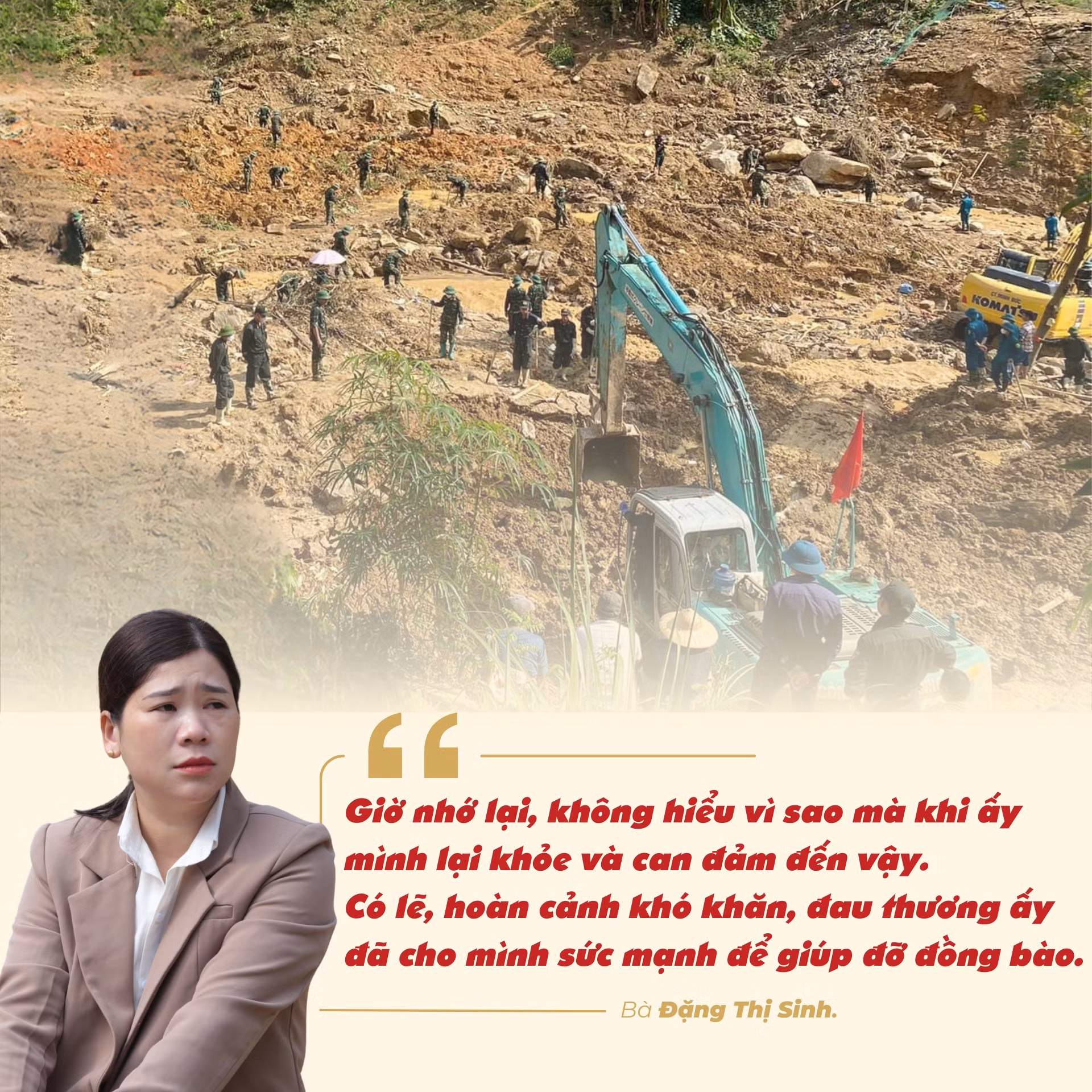 Kể từ hôm đó, bà Sinh ở lại vùng cô lập Nậm Tông để cùng bà con và các lực lượng chức năng tìm kiếm cứu nạn. Sau giờ phút đau thương lúc đầu, bà Sinh nhanh chóng bắt tay vào công việc, bởi bà hiểu bà con đang cần mình. Đó không chỉ là nhiệm vụ được giao mà còn là mệnh lệnh từ trái tim của nữ cán bộ đã gắn bó 15 năm với rẻo cao này.