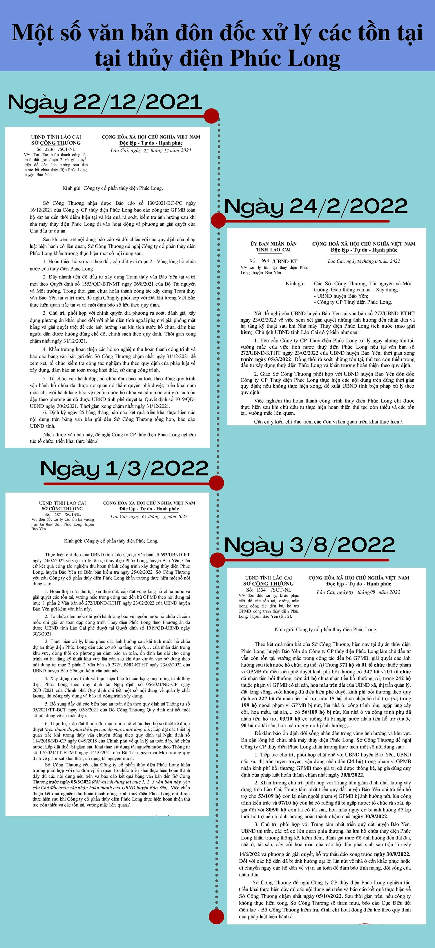 Đặc biệt, ngày 1/3/2022, Sở Công Thương tiếp tục có công văn yêu cầu Công ty Cổ phần Thủy điện Phúc Long khẩn trương hoàn thiện các thủ tục xin thuê đất, cấp đất vùng lòng hồ chứa nước và giải quyết những bất cập, vướng mắc trong công tác đền bù giải phóng mặt bằng; cắm mốc chỉ giới hành lang bảo vệ nguồn nước hồ chứa và cắm mốc chỉ giới an toàn đập công trình thủy điện; xử lý, khắc phục các ảnh hưởng đến hạ tầng, nhà ở… của người dân 6 xã ven 2 bờ sông Chảy sau khi thủy điện tích nước, phát điện. Đồng thời, có phương án đảm bảo an toàn, ổn định lâu dài cho công trình và hạ tầng kỹ thuật khu vực lân cận sau khi đưa dự án vào sử dụng… Tuy nhiên, nhiều nội dung yêu cầu của sở đến nay chưa được phía công ty thực hiện.