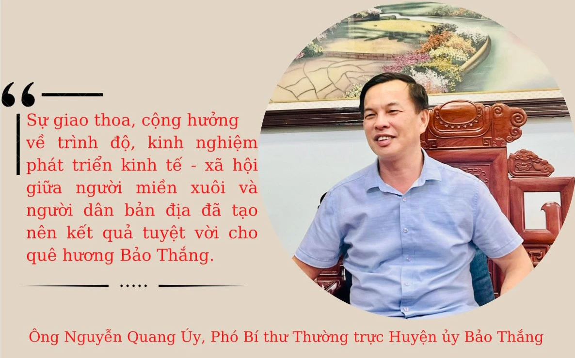 Tự hào về bước phát triển của quê hương, ông Nguyễn Quang Úy, Phó Bí thư Thường trực Huyện ủy Bảo Thắng chia sẻ: Sự giao thoa, cộng hưởng về trình độ, kinh nghiệm phát triển kinh tế - xã hội giữa người miền xuôi và người dân bản địa đã tạo nên kết quả tuyệt vời cho quê hương Bảo Thắng. Diện mạo nông thôn ngày càng đổi mới, đời sống, thu nhập của người dân cũng được nâng cao. Các vùng quê ở Bảo Thắng đang trở thành những vùng quê tươi đẹp, vùng quê “đáng sống”. Chúng tôi kỳ vọng, phát huy truyền thống của quê hương và mỗi dòng họ, Bảo Thắng sẽ tiếp tục bứt phá, không chỉ là huyện nông thôn mới của tỉnh, mà phải là huyện nông thôn mới điển hình của khu vực và cả nước.