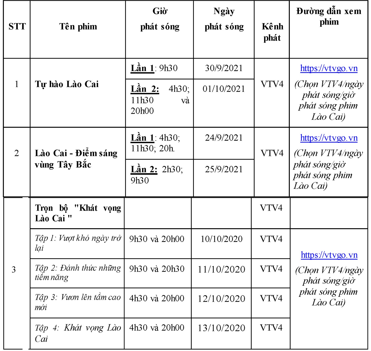 Trân trọng thông báo và giới thiệu lịch phát sóng và đường link xem các phim quảng bá về Lào Cai trên mạng internet, cụ thể như sau: