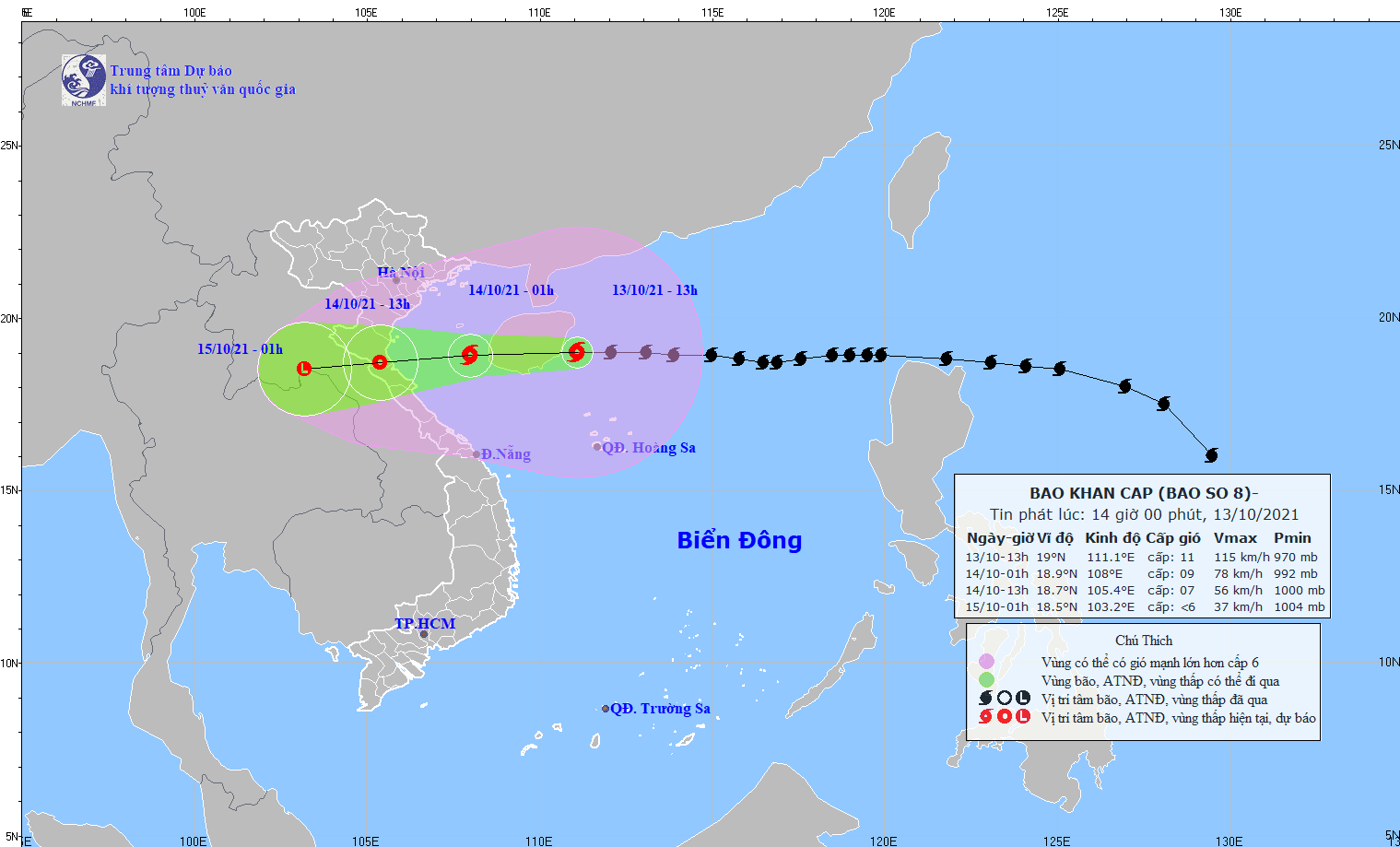 Theo Trung tâm Dự báo khí tượng thủy văn quốc gia, vào lúc 13 giờ hôm nay (13/10), vị trí tâm bão số 8 ở khoảng 19,0 độ Vĩ Bắc; 111,1 độ Kinh Đông, trên vùng biển phía Đông đảo Hải Nam (Trung Quốc), cách Thanh Hóa khoảng 600km, cách Nghệ An khoảng 610km, cách Hà Tĩnh khoảng 540km. Sức gió mạnh nhất vùng gần tâm bão mạnh cấp 11 (100-120km/giờ), giật cấp 14. Bán kính gió mạnh từ cấp 6, giật từ cấp 8 trở lên khoảng 350km tính từ tâm bão.