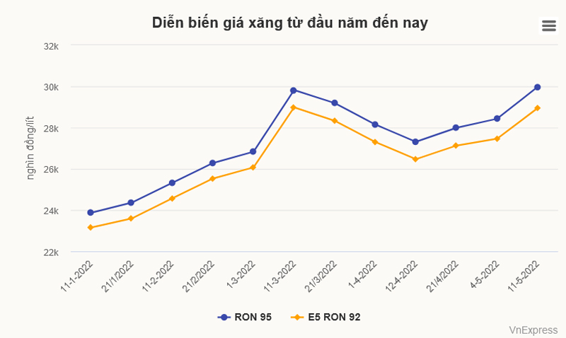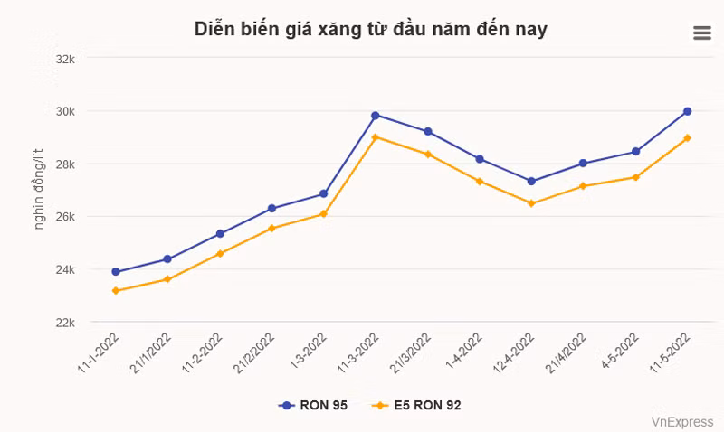 Ngày 11/5, giá xăng đã lập đỉnh mới khi tăng khoảng 1.550 đồng, lên mức 28.950 đồng một lít (với E5 RON92) và 29.980 đồng (RON95). Riêng loại xăng RON95 V (loại xăng cao cấp), giá đã vượt 30.000 đồng.