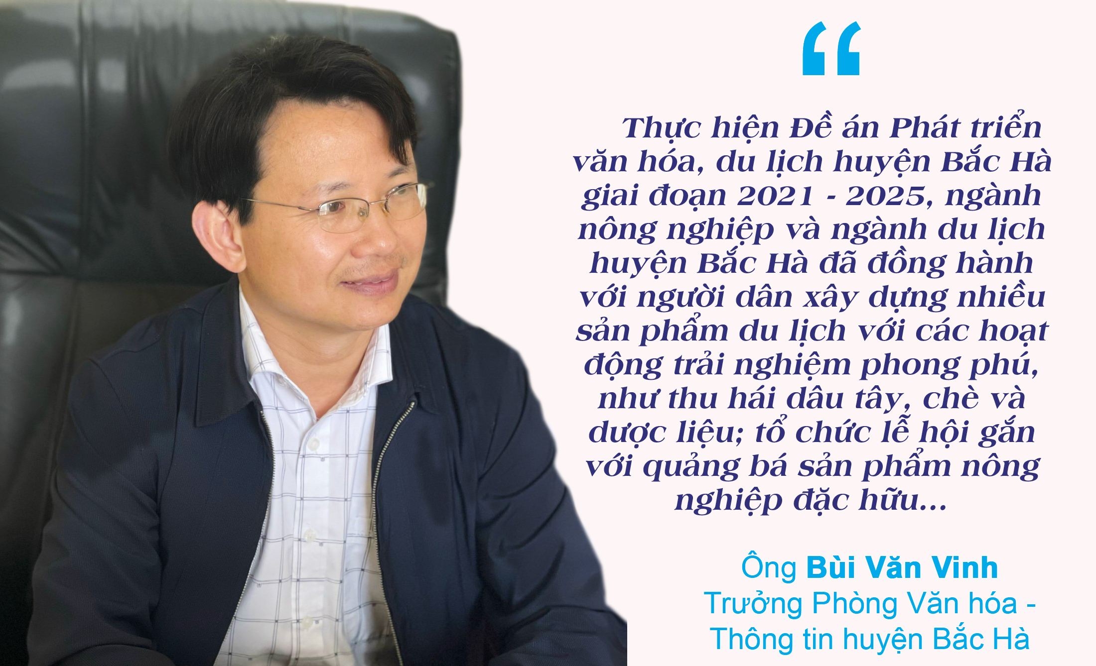 Còn tại huyện Bắc Hà đã xuất hiện nhiều mô hình du lịch nông nghiệp, như khám phá và trải nghiệm vườn mận tam hoa (xã Tà Chải, xã Na Hối); tham quan làng nghề nấu rượu ngô (xã Bản Phố); trải nghiệm làm cốm cùng bà con người Tày (xã Tà Chải); chụp ảnh tại vườn hoa cát cánh; trải nghiệm hái dâu tây Hàn Quốc (xã Lùng Phình, xã Nậm Mòn)… Ông Bùi Văn Vinh, Trưởng Phòng Văn hóa - Thông tin huyện Bắc Hà cho biết: Đề án Phát triển văn hóa, du lịch huyện Bắc Hà giai đoạn 2021 - 2025 xác định phát triển du lịch phải gắn với phát triển nông nghiệp. Trên cơ sở đó, ngành nông nghiệp và ngành du lịch huyện Bắc Hà đã đồng hành với người dân xây dựng nhiều sản phẩm du lịch với các hoạt động trải nghiệm phong phú, như thu hái dâu tây, chè và dược liệu; tổ chức lễ hội gắn với quảng bá sản phẩm nông nghiệp đặc hữu…