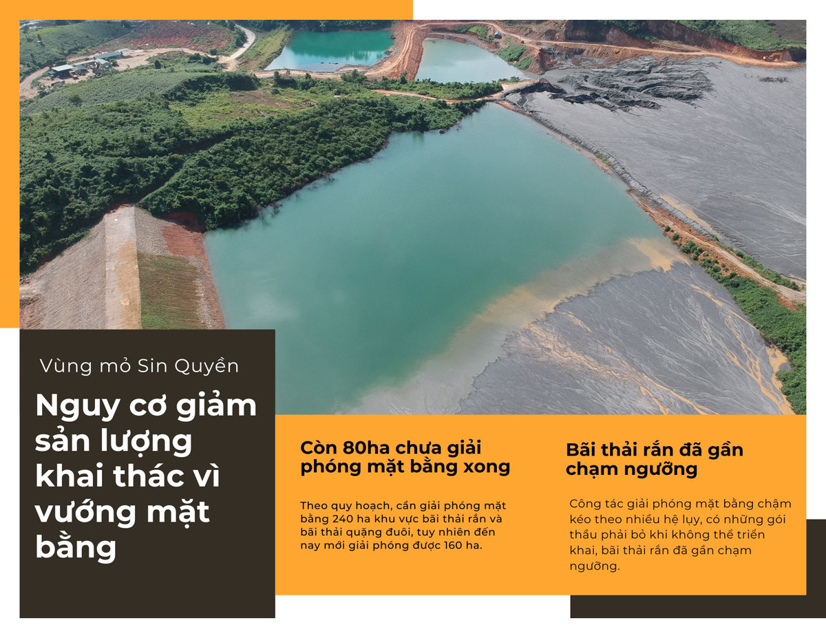 Công tác giải phóng mặt bằng chậm không chỉ khiến cuộc sống người dân bị ảnh hưởng, mà còn có nguy cơ ảnh hưởng trực tiếp đến hoạt động khai thác, sản xuất của Chi nhánh Mỏ tuyển đồng Sin Quyền, Lào Cai - Vimico. Theo lãnh đạo chi nhánh, theo kế hoạch, công tác giải phóng mặt bằng phải hoàn thiện cách đây 2 năm, tuy nhiên mọi chuyện vẫn dậm chân tại chỗ. Công tác giải phóng mặt bằng chậm kéo theo nhiều hệ lụy, có những gói thầu phải bỏ khi không thể triển khai, bãi thải rắn đã gần chạm ngưỡng, nếu không nhanh chóng bố trí được vị trí đổ thải sẽ phải giảm sản lượng khai thác, ảnh hưởng đến nguồn cung nguyên liệu cho nhà máy tuyển…