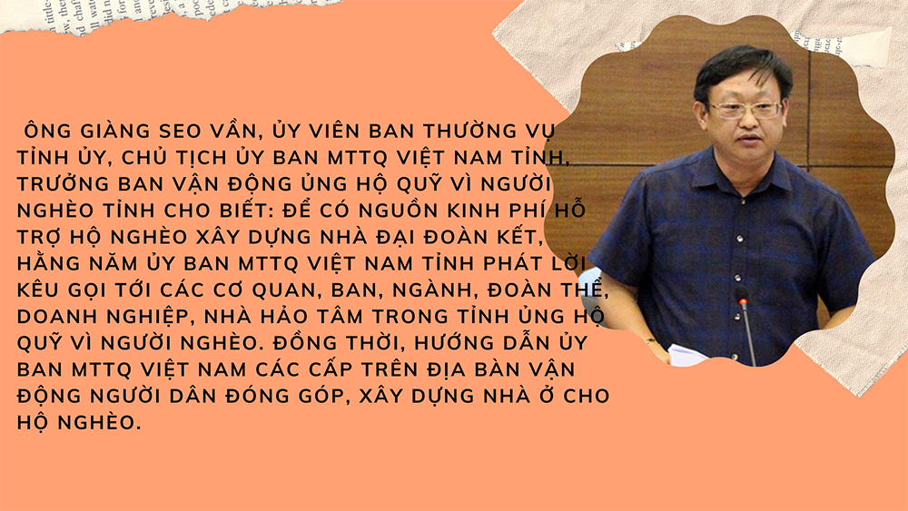 Theo thống kê của Ủy ban MTTQ Việt Nam tỉnh Lào Cai, giai đoạn 2011 đến nay, từ nguồn Quỹ Vì người nghèo và nguồn lực xã hội hóa, ủy ban MTTQ Việt Nam các cấp trong tỉnh đã khảo sát, triển khai kế hoạch xây mới và sửa chữa 4.323 nhà “Đại đoàn kết”. Trong đó làm mới 2.014 nhà và sửa chữa hàng nghìn ngôi nhà cho gia đình nghèo, hộ cận nghèo và gia đình có hoàn cảnh khó khăn với tổng số tiền hơn 61 tỷ đồng.