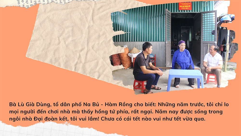 Cùng chung niềm vui được hỗ trợ nhà “Đại đoàn kết” như gia đình anh Nhất, gia đình bà Lù Già Dùng (sinh năm 1946) ở tổ dân phố Na Bủ - Hàm Rồng, thị trấn Mường Khương (huyện Mường Khương) vừa được trải qua cái tết 2022 đầm ấm, hạnh phúc trong căn nhà khang trang.