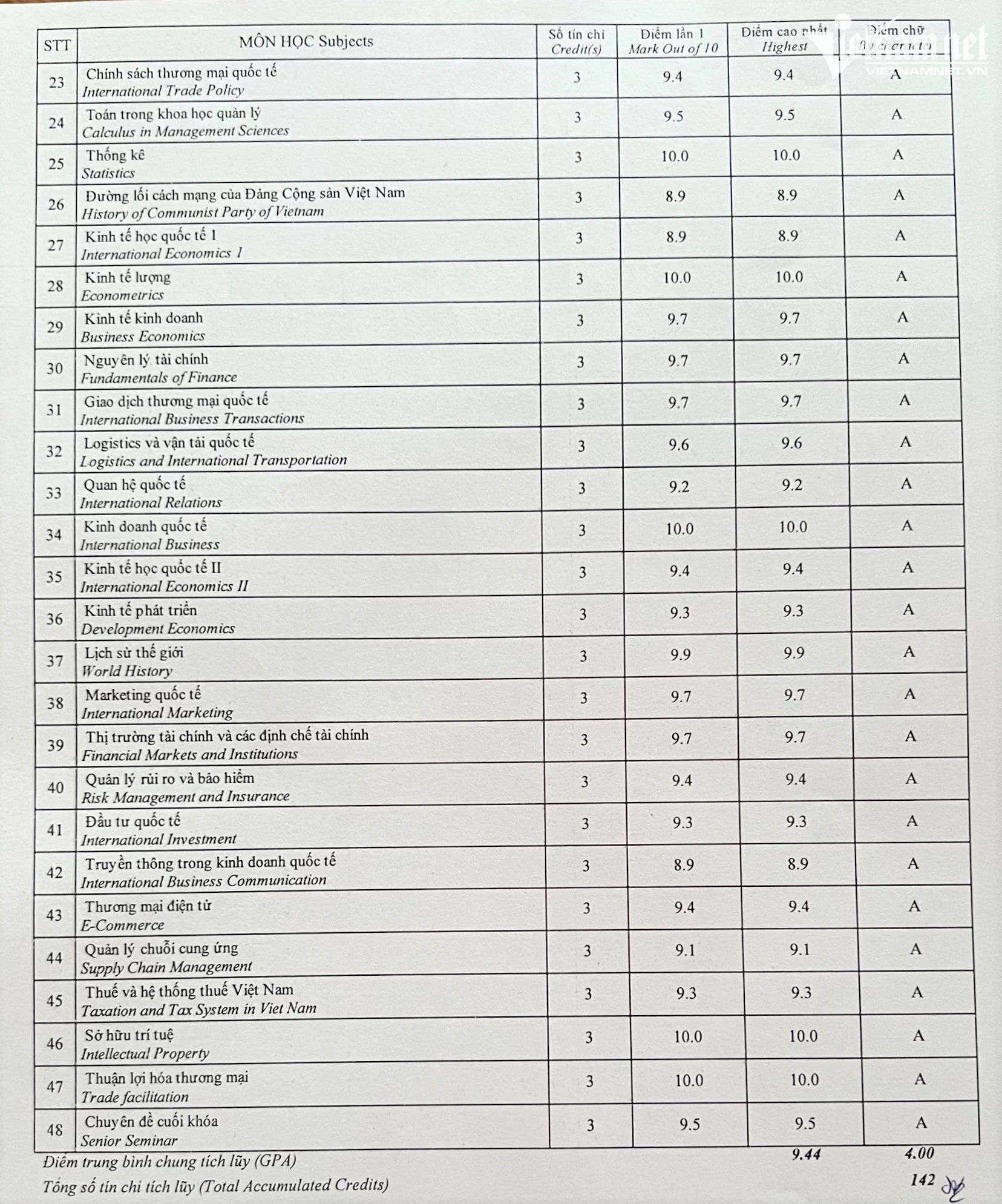 Trong 4 năm theo học ở Trường ĐH Ngoại thương, ở 48 môn học với tổng cộng 142 tín chỉ, Đỗ Hoàng Phương Nhi (sinh viên khóa 57 Chương trình tiên tiến Kinh tế đối ngoại) đều đạt điểm A, qua đó có điểm trung bình chung tích lũy đạt 4.0/4.0.