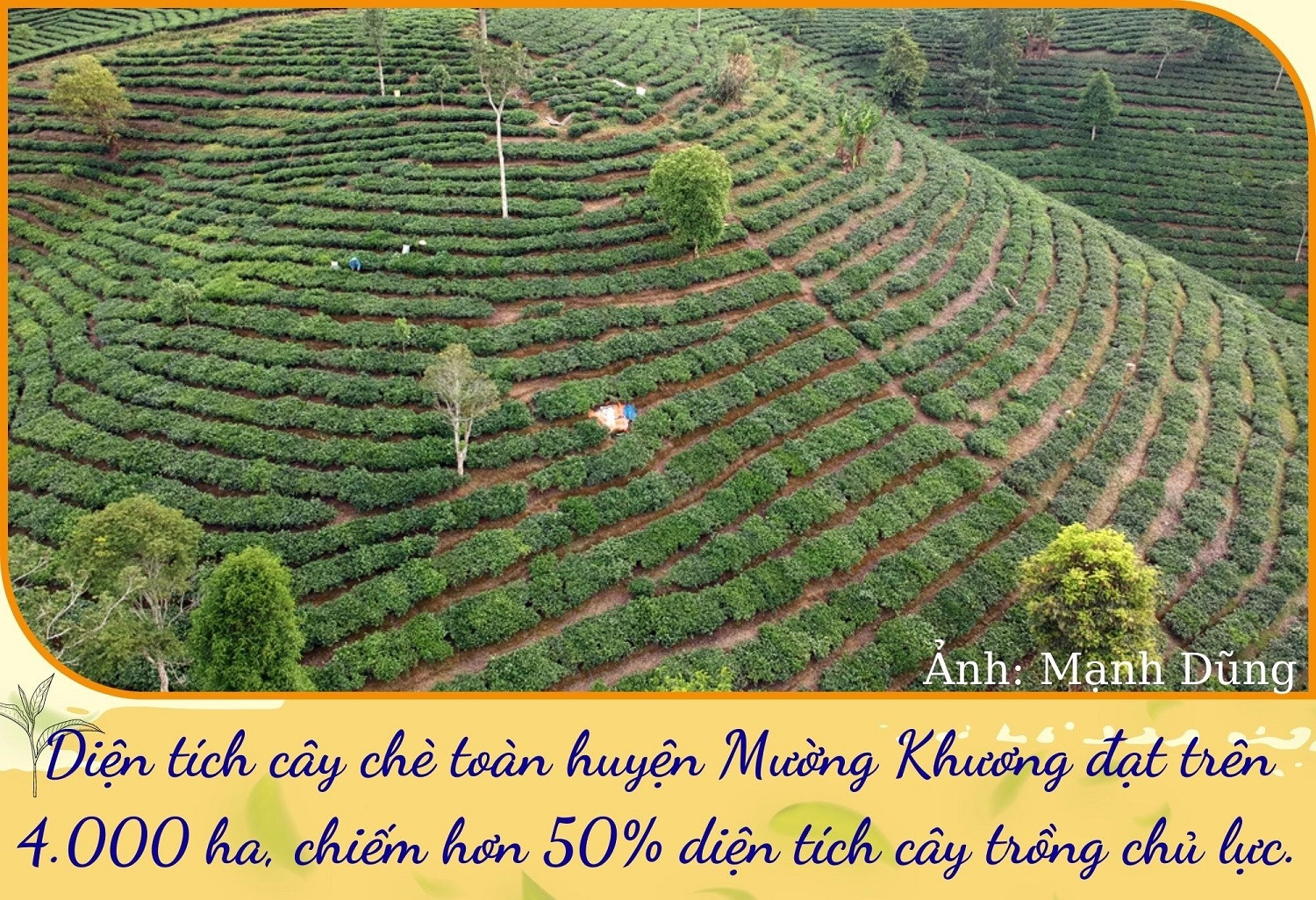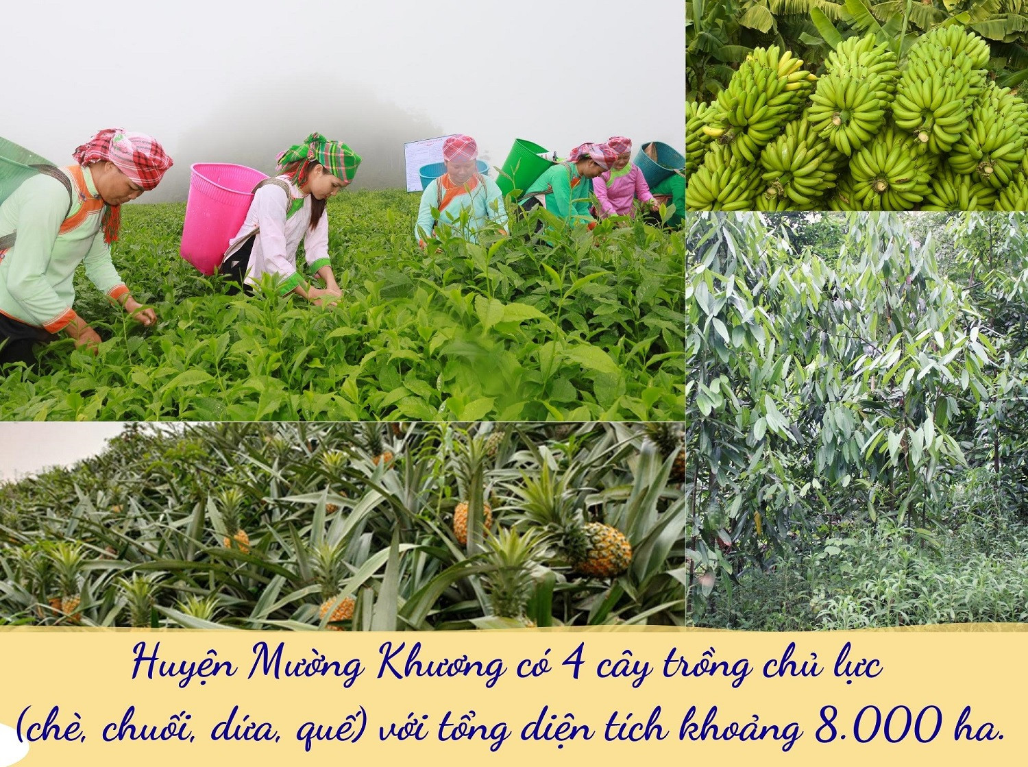 Huyện Mường Khương dẫn đầu toàn tỉnh về sản xuất nông nghiệp hàng hóa. Trong 5 loại cây trồng chủ lực thì huyện Mường Khương có 4 loại cây (dứa, chuối, chè, quế) với tổng diện tích trên 8.000 ha. Riêng cây chè chiếm 50% diện tích cây trồng chủ lực của huyện. Từ đầu năm đến nay, sản lượng chè búp của huyện Mường Khương đạt trên 16.000 tấn, cung cấp nguồn nguyên liệu ổn định cho 7 nhà máy chế biến chè. Sản phẩm chế biến từ chè Mường Khương được cung ứng ra thị trường trong nước với giá tương đối ổn định. Bình quân giá bán 350.000 đồng/kg chè khô. Chè Mường Khương xuất khẩu chủ yếu sang các nước Đông Âu, Trung Đông, Đài Loan, nguồn thu hơn 100 tỷ đồng/năm.