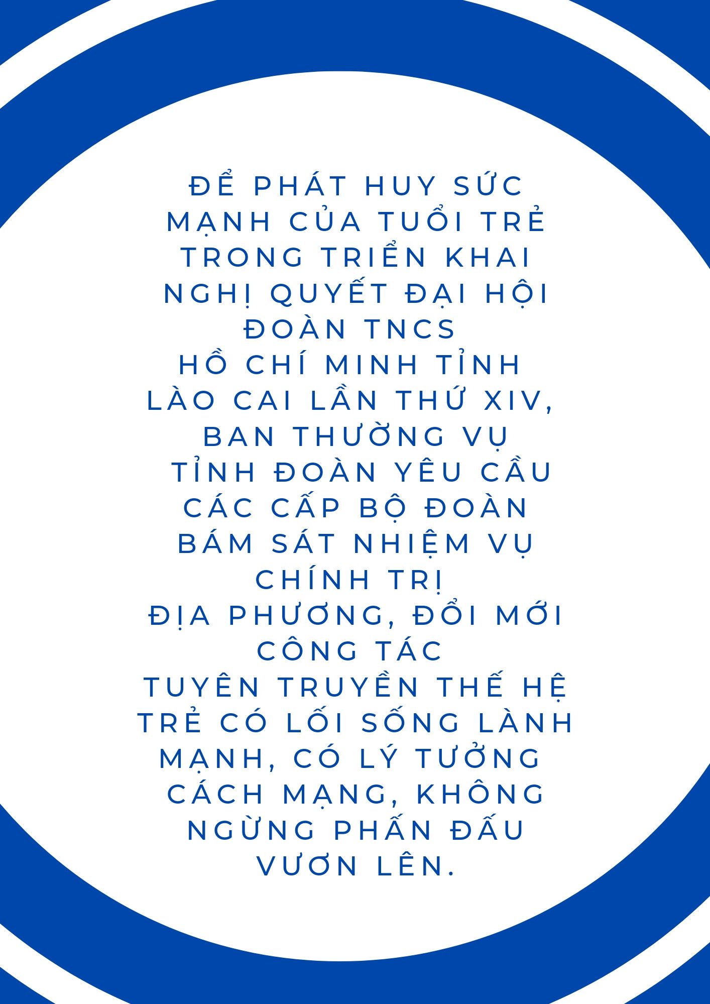 Thanh niên cùng hành động triển khai nghị quyết đại hội đoàn diễn ra sôi nổi với nhiều hoạt động đa dạng về nội dung, trong đó trọng tâm là tuyên truyền về thành công Đại hội Đoàn TNCS Hồ Chí Minh tỉnh Lào Cai lần thứ XIV; hoạt động đoàn tham gia xây dựng Đảng; tham gia xây dựng nông thôn mới, đô thị văn minh; hỗ trợ đoàn viên, thanh niên khởi nghiệp, lập nghiệp; các hoạt động an sinh xã hội; bảo vệ môi trường, ứng phó với biến đổi khí hậu... Với tinh thần “Bản lĩnh - tiên phong - đoàn kết - sáng tạo - phát triển”, những hoạt động ý nghĩa của tuổi trẻ góp phần thực hiện thắng lợi Nghị quyết đại hội Đoàn TNCS Hồ Chí Minh tỉnh Lào Cai lần thứ XIV.