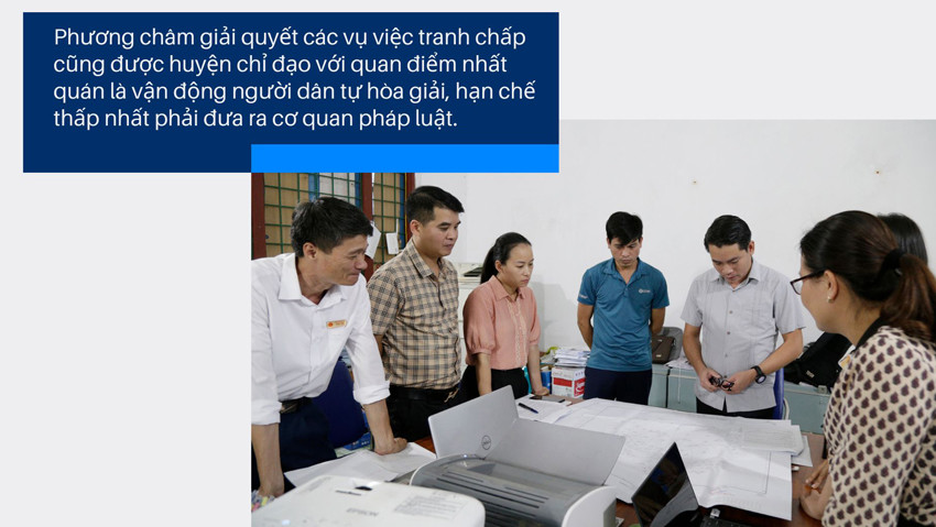 Phương châm giải quyết các vụ việc tranh chấp cũng được huyện chỉ đạo với quan điểm nhất quán là vận động người dân tự hòa giải, hạn chế thấp nhất phải đưa ra cơ quan pháp luật.