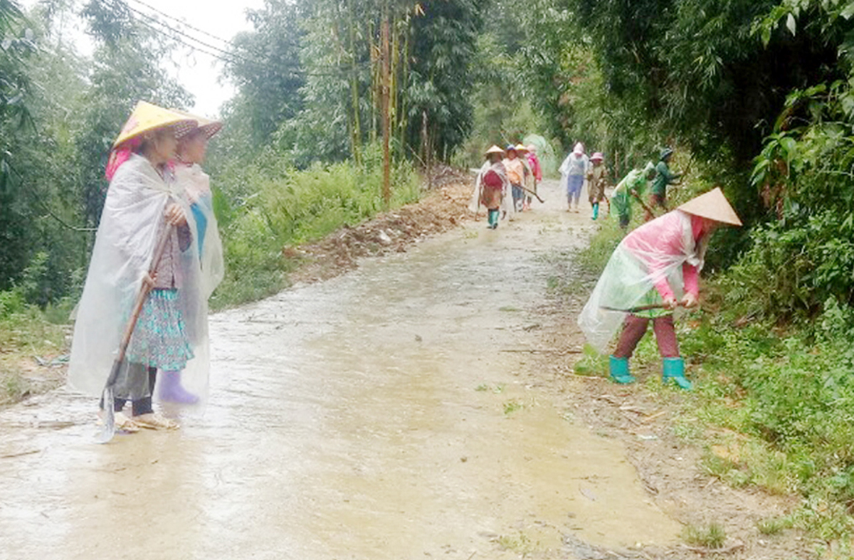 Người dân thôn Giàng Chá Chải, xã Nàn Sín tổ chức dọn dẹp vệ sinh đường giao thông liên thôn.