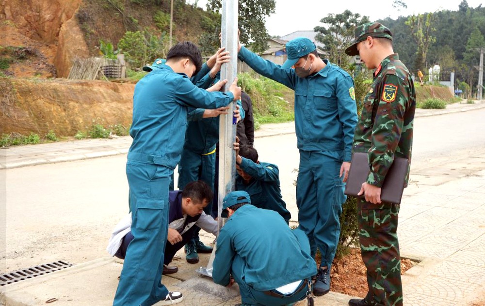 Lực lượng DQTV tham gia công tác dân vận dựng cột đèn thắp sáng đường quê cho người dân.