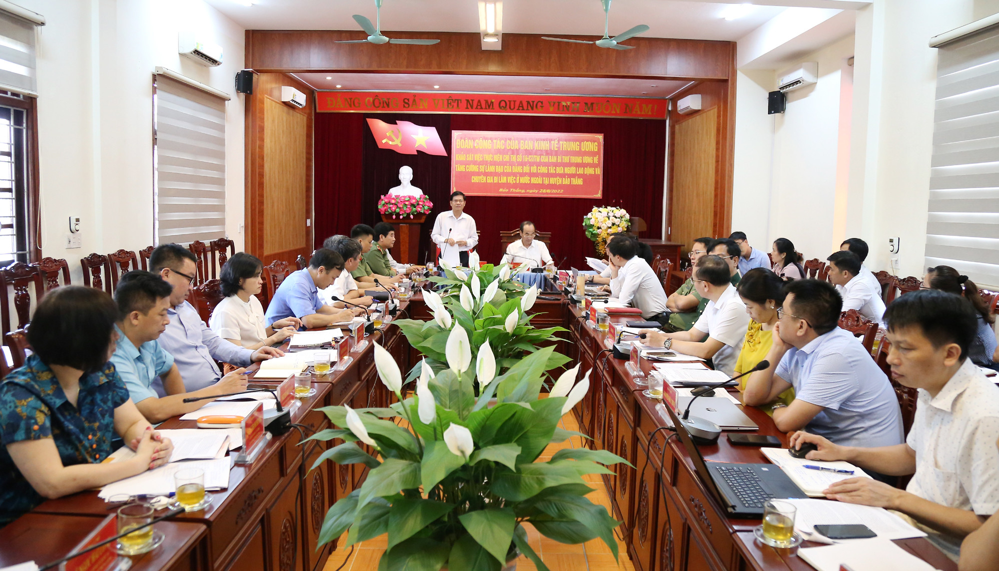 LCĐT - Sáng 28/6, Đoàn công tác của Ban Kinh tế Trung ương do đồng chí Đỗ Ngọc An, Phó Trưởng Ban làm Trưởng đoàn đã có buổi làm việc tại huyện Bảo Thắng để khảo sát tình hình, kết quả thực hiện Chỉ thị 16-CT/TW ngày 8/5/2012 của Ban Bí thư khóa XI “về tăng cường sự lãnh đạo của Đảng đối với công tác đưa người lao động và chuyên gia Việt Nam đi làm việc ở nước ngoài”.