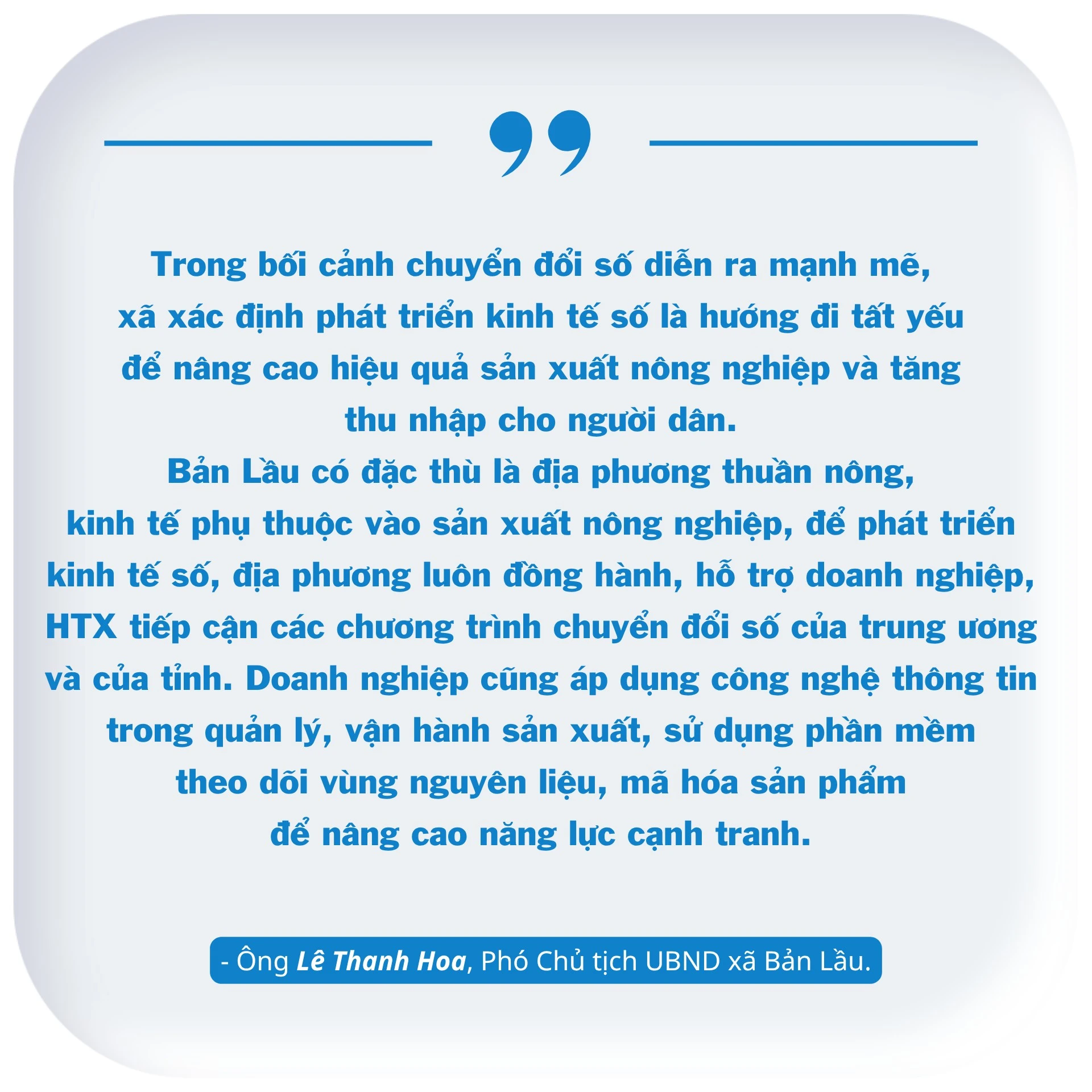 Phát triển kinh tế số tại Bản Lầu là hướng đi lâu dài, gắn với thực tiễn phát triển của vùng nông thôn. Từ việc ứng dụng mã vùng trồng, truy xuất nguồn gốc đến thương mại điện tử và quảng bá sản phẩm trên nền tảng số, mỗi bước tiến đều góp phần tạo nên kinh tế nông nghiệp hiện đại, hiệu quả kinh tế cao và bền vững hơn.