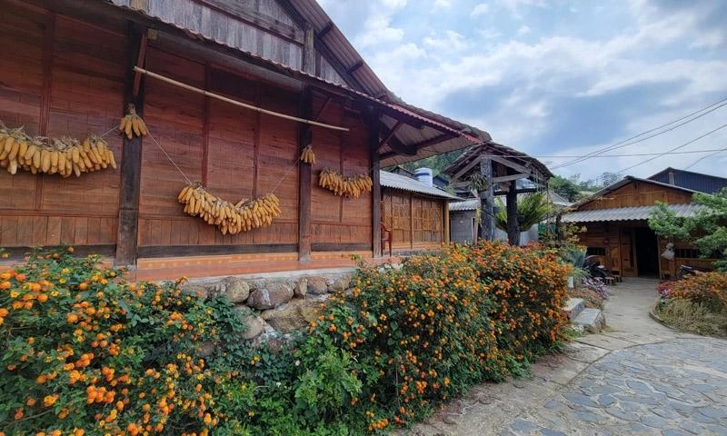 Góc nào của ngôi nhà gỗ truyền thống được làm homestay đều được người dân trang trí bằng những loại hoa mộc mạc, những bắp ngô vàng ươm.